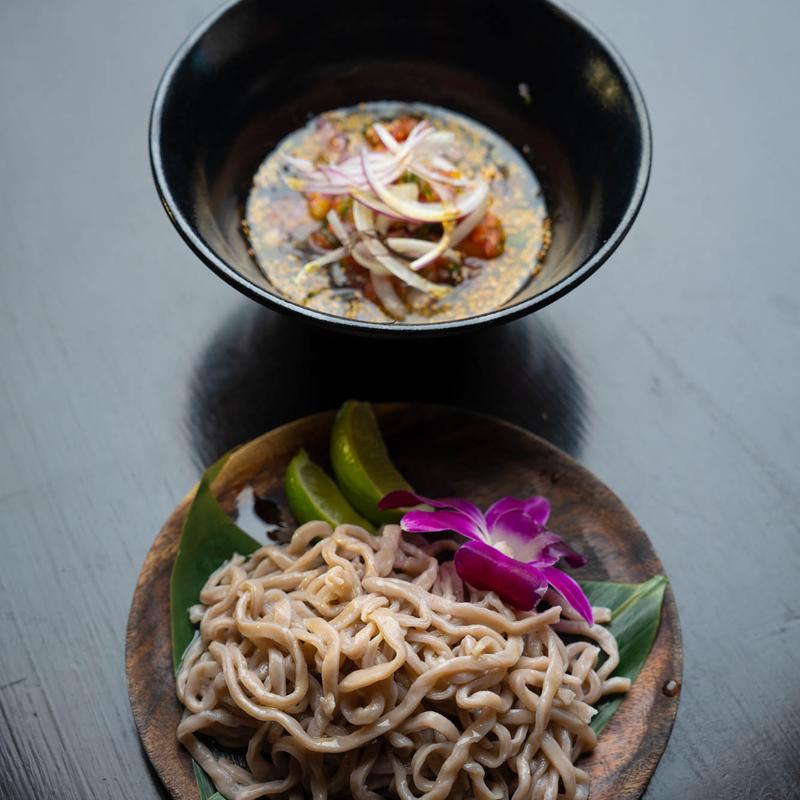 Our original POI Kneaded homemade pasta, dipping into white soy sauce-based ahi poke cold soup.